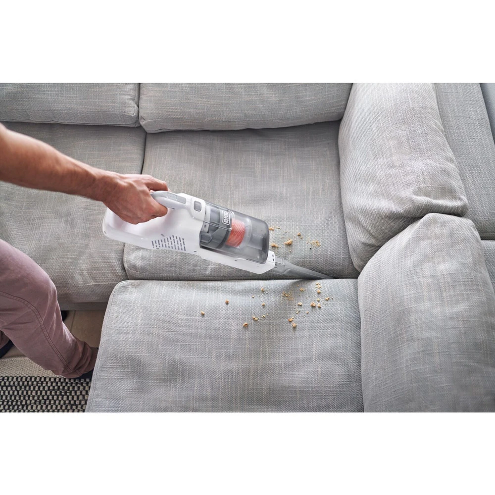 - ACCESS CONFINED SPACES UNDER COUCHES AND BEDS with front-facing dustbin which allows stick vacuum to lie flat while cleaning
