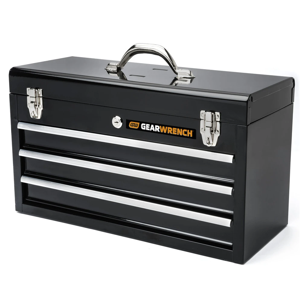 The 3 Drawer Tool Box by GearWrench is a Portable Tool Box with Ball Bearing Drawer Slides. Keyed Center Lock for Security. Includes Cantilever Tray. Expertly crafted from premium materials. Designed to match rigorous quality standards. High quality at a budget-friendly price. Top Compartment 2.5 in. Height. Drawers 2 in. Height. Overall Height: 12 in.. It is Black in color. GearWrench does its utmost to provide the best possible solutions for your needs. All products by GearWrench are made with expert care and created by professionals to meet all your requirements.